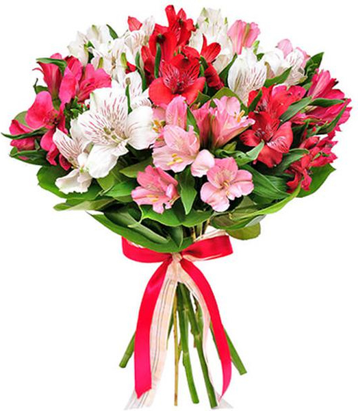 1 белая альстромерия, 1 розовая альстромерия, 1 малиновая альстромерия, зелень, лента2 белых альстромерии, 2 розовых альстромерий, 2 малиновых альстромерий, зелень, лента4 белых альстромерии, 4 розовых альстромерий, 3 малиновых альстромерий, зелень, лента
