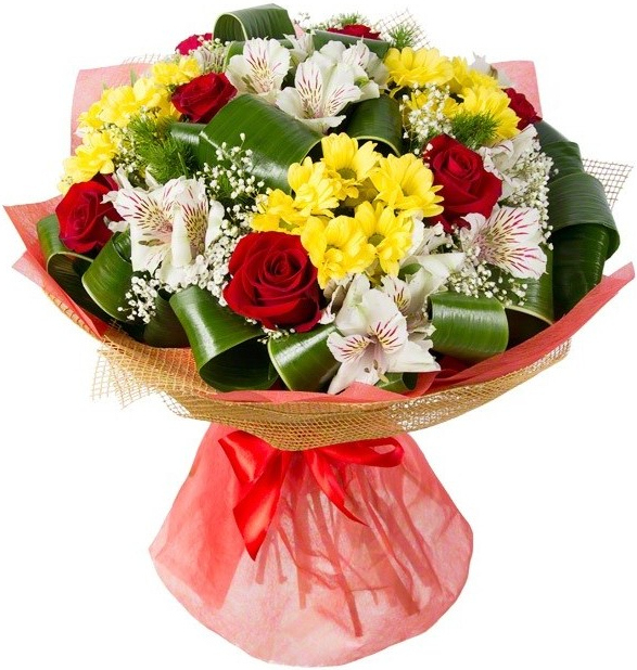 1 желтая хризантема, 1 белая альстромерия, 3 красных розы, гипсофила, аспедистра, упаковка, лента3 желтых хризантемы, 5 белых альстромерии, 7 красных роз, гипсофила, аспедистра, упаковка, лента4 желтых хризантемы, 7 белых альстромерии, 8 красных роз, гипсофила, аспедистра, упаковка, лента